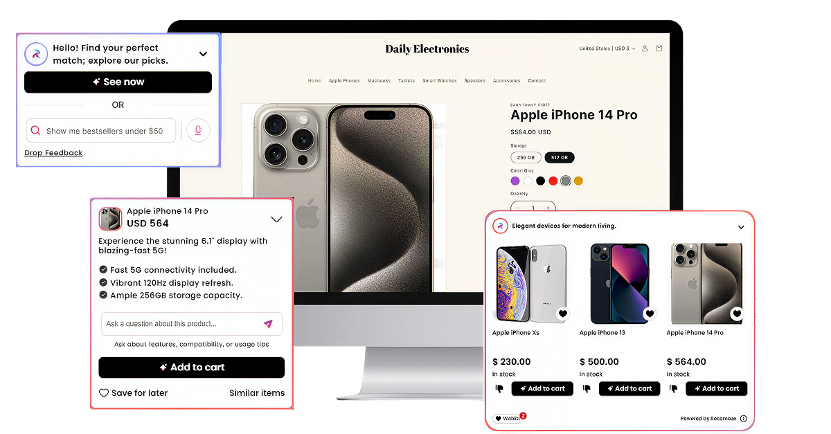 Shoppers bounce when they feel like strangers. Recomaze builds a persistent, cookieless profile that adapts recommendations in real time.